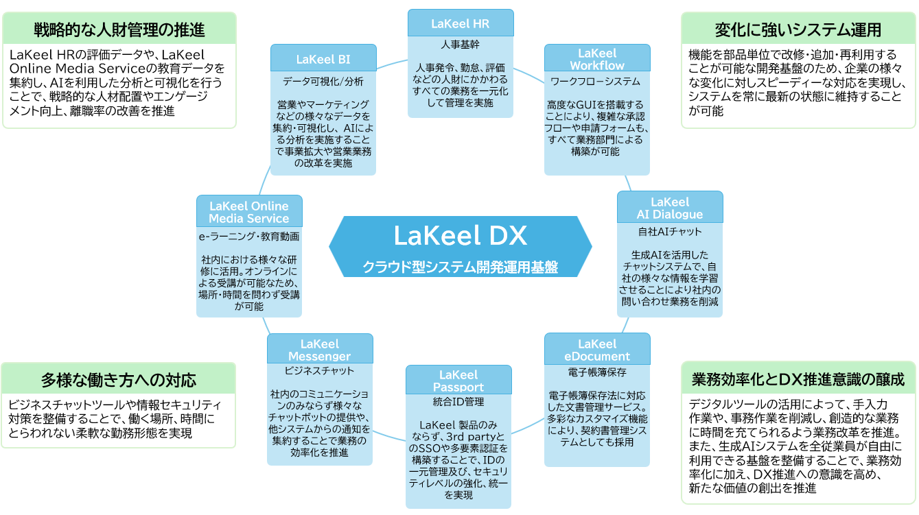 LaKeel DXは柔軟且つスピーディーに業務システムを構築することができるクラウド型のシステム開発・運用基盤です。開発部門の社員の生産性は高まり、ビジネス部門の社員は必要な業務システムを速く手に入れることができます。その他、LaKeel製品(自社プロダクトサービス)を活用することで、社内のDXを推進していきます。LaKeel製品はマイクロサービスアーキテクチャを活用し、部品を組み合わせてシステムを構築しているため、改修や機能追加は部品単位で行うことができるため、システムがレガシー化しない仕組みになっています。