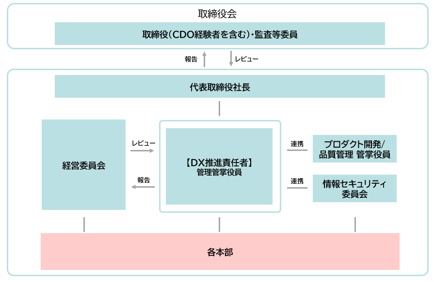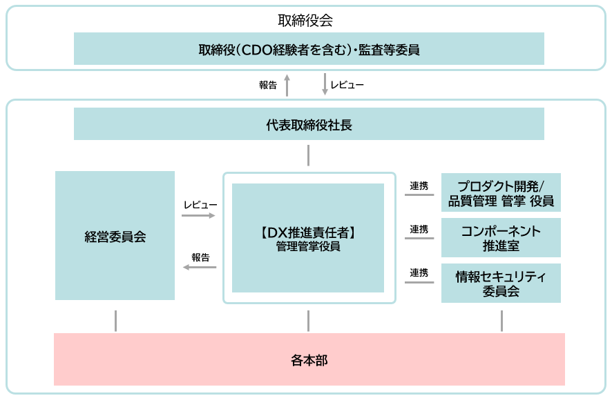 DX推進室は、プロダクト開発/品質管理 管掌 取締役、コンポーネント推進室、情報セキュリティ委員会と連携し、DXを推進する。また、CDO(最高デジタル責任者)経験者である社外取締役の助言を受け、DX推進の充実を図る。
