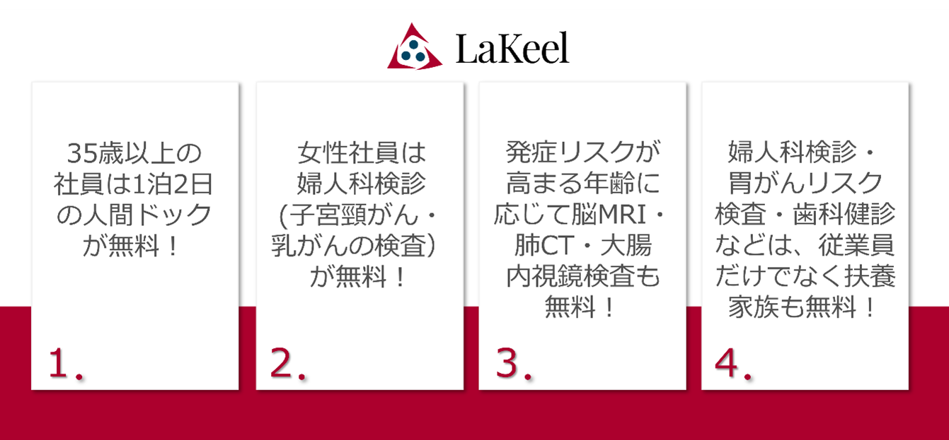健康診断の受診は義務化されていますが、ラキールは20代が社員の約50%であり、特に若い世代にとってはわざわざ時間をとって行くのが面倒だと思われがちです。そこで、以下のような充実した健診支援制度を用意し、若いうちから健診結果を基に生活習慣の改善意識を高めることの大切さを発信しています。